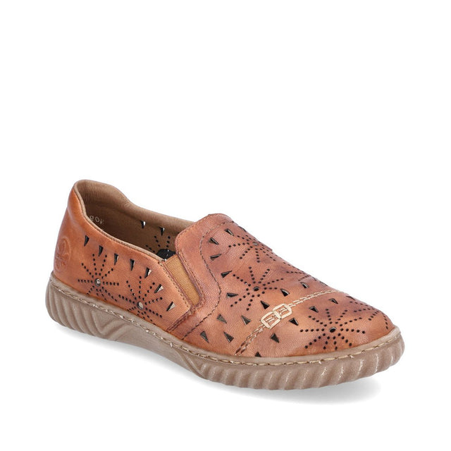 Product Description: Slip into ultimate comfort and style with these copper-colored slippers made from smooth leather by Rieker. The elastic insert makes it easy to quickly slip them on and off, while the open-work style adds a fresh, modern touch to the design. The grippy sole ensures optimal support and stability with every step. Inside, the extra soft cover sole provides added comfort for long-lasting wear. The shoe is lined with open-pored synthetic material that is breathable and moisture-absorbing, keeping your feet fresh and comfortable. Pure luxury for your feet this spring and summer!
