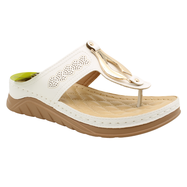 Add a touch of elegance to your warm-weather wardrobe with these vegan leather thong sandals. Featuring an eye-catching ornamental buckle on the vamp, these sandals blend style and simplicity. The padded comfort insoles provide exceptional cushioning, while the lightweight outsoles ensure easy, all-day wear. Perfect for sunny outings or casual occasions, they’re a must-have for effortless style.