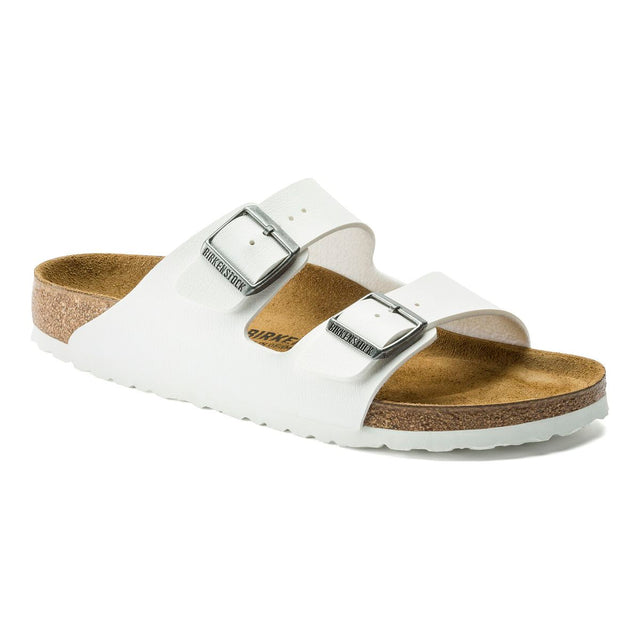 The Birkenstock Arizona White is a classic two-strap sandal known for its iconic silhouette and unrivaled comfort. Crafted with a sleek Birko-Flor upper, this style mimics leather while remaining skin-friendly, tear-resistant, and easy to care for. A contoured cork-latex footbed molds to your foot over time, providing customized arch support and promoting proper posture. The suede-lined footbed enhances comfort, while the lightweight EVA outsole ensures flexibility and shock absorption. Finished with adjustable metal pin buckles, this sandal delivers the ideal combination of durability, style, and orthopedic support, making it a perfect warm-weather essential.