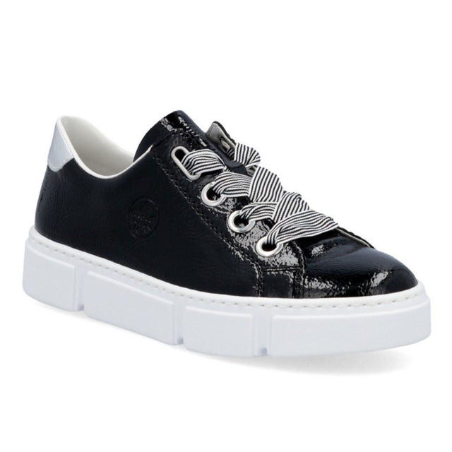 Product Description: Stay ahead of the curve with these casual glossy black sneakers by Rieker. Perfect for all your walks, these sneakers offer both style and comfort. The wide lacing ensures a secure and customizable fit, while the shock-absorbing sole offers a comfortable walking experience, even during long periods of wear. The extra soft interchangeable cover sole enhances comfort for all-day use. These sneakers are the epitome of cool and comfort!