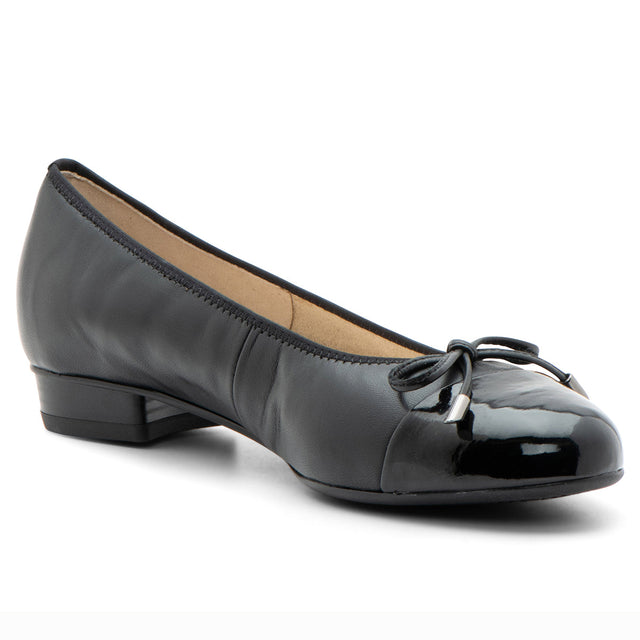 Stay effortlessly stylish with this essential ballet flat by ara. It features a charming bow detail with finely crafted hardware. Classic contrasting materials form a trendy cap toe, making this slip-on perfect for day-to-night wear. The Belinda by ara also boasts an elasticized topline for a personalized fit and extra comfort.