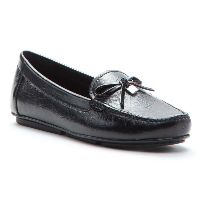 Classic flat moccasins with toebox stitching and traditional contours, finished with a leather bow detail on the vamp.