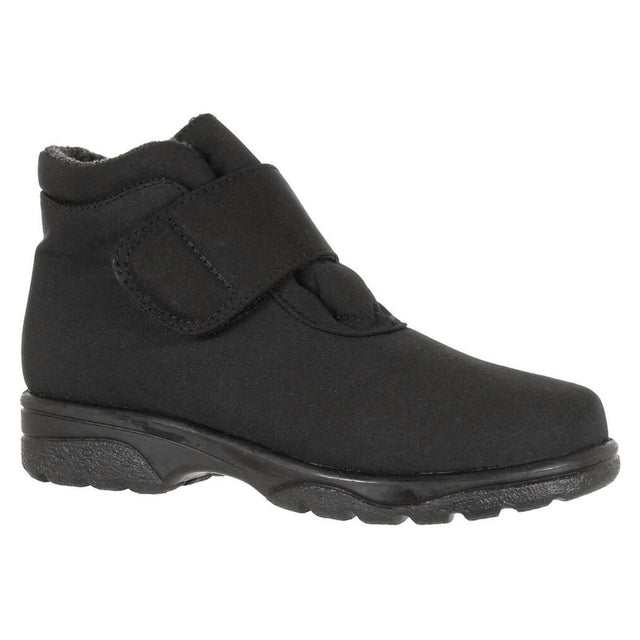 Ankle-height women’s winter boot in smooth black waterproof fabric with rounded toe, wide Velcro strap across the ankle, soft insulated lining, and flexible treaded rubber sole for warmth and stability in cold, wet conditions. Style #T99849-B20