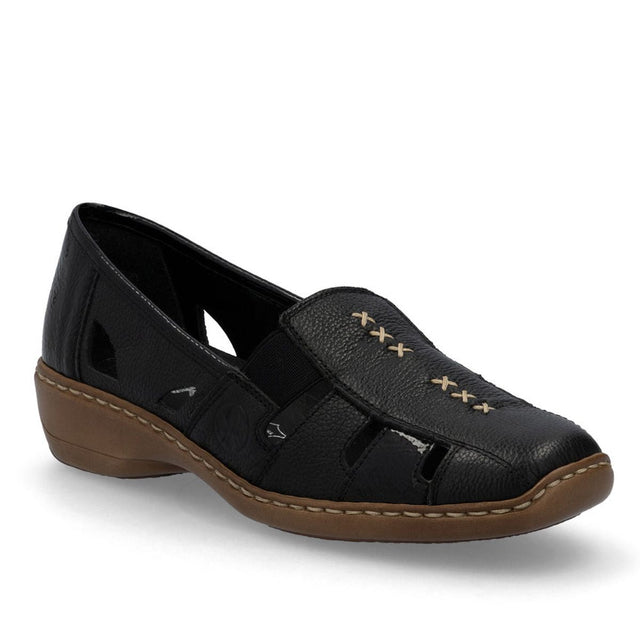 These elegant black ladies shoes are designed for both style and comfort. Made from premium leather, the shoes feature a durable RIRICON sole for excellent support and flexibility. The soft insole ensures all-day comfort, while the punched/interweave design adds a unique, textured detail to the shoe’s appearance. The wedge heel offers a stylish lift and added comfort, making these shoes perfect for both casual and semi-formal occasions. With a combination of functionality and fashion, they provide a chic yet comfortable option for any wardrobe.