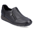 The Height of Comfort and Style! These steel black Rieker shoes, crafted from smooth leather, effortlessly blend modern design with exceptional comfort. Featuring a stitchdown construction, this model is robust, flexible, and offers a perfect fit. The convenient zipper ensures quick and hassle-free entry, making these shoes ideal for on-the-go days.