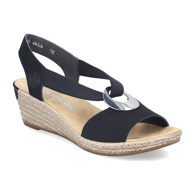 These wedge sandals by Rieker are designed for fashion-forward comfort. Made from imitation leather, they combine practicality with style. The elastic inserts ensure a perfect fit, while the wide straps and heel strap provide optimal support for your feet. The shock-absorbing and lightweight RIRICON sole with a wedge heel offers long-lasting comfort, even on extended wear. Perfect for spring and summer, these sandals are an ideal addition to any wardrobe.