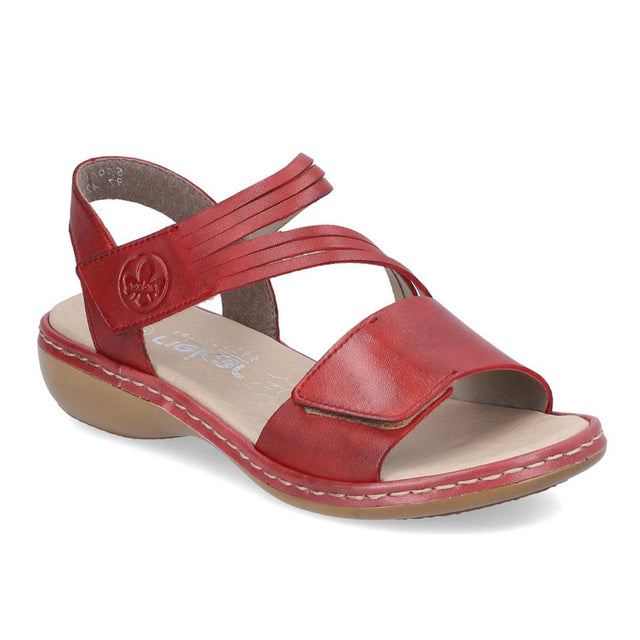 These red strap sandals by Rieker, made of smooth leather, are the perfect combination of style and comfort. With the ideal support and perfect fit guaranteed by the straps, hook-and-loop fastener, and heel strap, you'll be able to enjoy every step. The light, shock-absorbing sole offers ultimate comfort, while the narrow E 1/2 fit provides additional support. Step into your best summer yet with these must-have sandals!