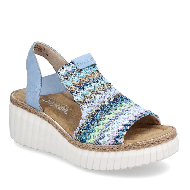 Fashion-forward and full of charm, these sky blue wedge sandals by Rieker are a must-have for the season! Designed for comfort and style, the sandals feature adjustable straps, an elastic insert, and a heel strap to ensure an ideal fit. The multi-colored mesh design adds a vibrant touch, making them a striking addition to any outfit. With their light and shock-absorbing sole and a comfortable wedge heel, these sandals promise lasting comfort, whether you're strolling through the park or enjoying an evening out. Plus, the removable soft cover sole adds extra coziness to every step.