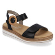 Elevate your warm-weather wardrobe with the Remonte Lugano Velcro sandal in sleek black leather. Part of the exclusive Remonte by ELLE collection, this fashion-forward sandal blends modern European design with long-lasting comfort. The elegant silhouette features wide crossover front straps and a slim ankle strap with an easy hook-and-loop closure for a secure, adjustable fit. Crafted with a lightweight, flexible platform sole and a soft, removable cushioned footbed, this sandal delivers daylong support whether you're strolling city streets or heading out for summer occasions. A cool velour-synthetic lining enhances breathability, while the 40mm heel adds just the right amount of lift. Designed in a regular width, the Lugano sandal is a stylish, versatile choice for sunny-day dressing.