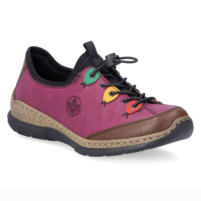 Product Description: An all-time favorite! These brown/violet Rieker shoes combine classic design with exceptional comfort. The shoe is built in the stitchdown style, making it both robust and flexible. The combination of elastic lacing and a flexible shaft edge makes putting them on a breeze. The fashionable eyelet decoration adds a stylish touch and creates a striking look. The light and shock-absorbing sole provides comfort with every step, while the extra soft MemoSoft cover sole adds an additional layer of comfort. Experience the perfect blend of fashion and wellness with Rieker style!