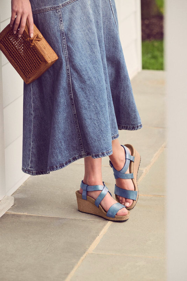 Add a refined lift to your summer wardrobe with the Sibyl Wedge Sandal from Papillio by Birkenstock. Crafted in Portugal, this elegant sandal combines the fashion-forward appeal of a 40 mm wedge heel with the trusted comfort of Birkenstock’s contoured footbed. The premium leather upper and suede-lined insole deliver a soft, luxurious feel against the skin, while the lightweight PU footbed and sole offer all-day support. A rounded metal pin buckle allows for a customizable fit, making the Sibyl a versatile choice for everything from casual outings to dressier occasions.