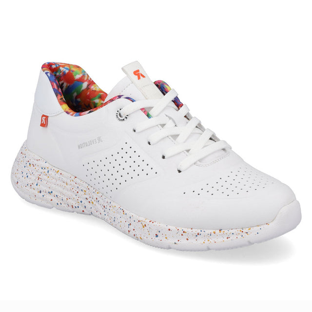 Meet your new favorite shoe: the Rieker EVOLUTION sneaker in sleek smooth white speck leather, designed for those who value timeless style and all-day comfort. These sneakers offer the perfect blend of fashion and practicality, making them ideal for your spring and summer wardrobe.
