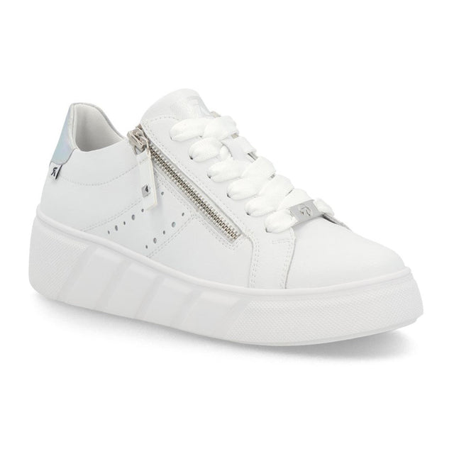 Elevate your footwear collection with these White and Mother-of-Pearl ladies shoes by Rieker Sport. Designed for both style and comfort, these shoes feature a high-quality leather upper and a durable Ethylen Vinyl Acetate (EVA) sole that offers exceptional flexibility and support. The removable soft insole provides personalized comfort, while the sport sole (from 25mm) ensures a cushioned fit. The chic platform heel adds height and stability, making these shoes perfect for casual and semi-formal occasions. A versatile and stylish choice for all-day wear.